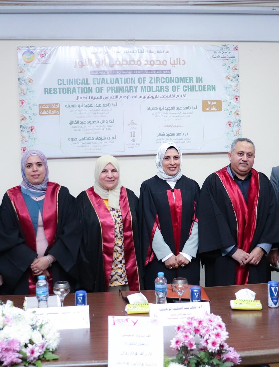 شهدت كلية طب الأسنان جامعة طنطا انعقاد المناقشة العلنية لرسالة الماجستير للطبيبة داليا محمد مصطفى أبو النور وذلك يوم الثلاثاء الموافق ٢٠٢٦/٢/١٠ وذلك بقاعة المناقشات الدور السادس، وتكونت هيئة الإشراف من السادة الأساتذة :