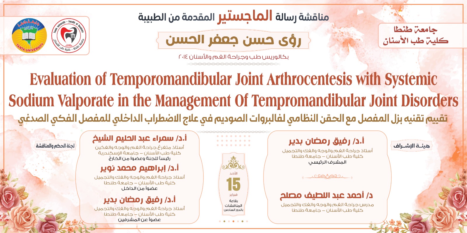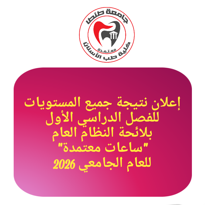 تعلن إدارة الدراسات العليا بكلية طب الأسنان جامعة طنطا عن انعقاد مناقشة رسالة الماجستير للطبيبة رؤى حسن جعفر الحسن وذلك يوم الاحد الموافق ٢٠٢٦/٢/١٥ م و ذلك بقاعة المناقشات بالدور السادس، وتتكون هيئة الإشراف من السادة الأساتذه :