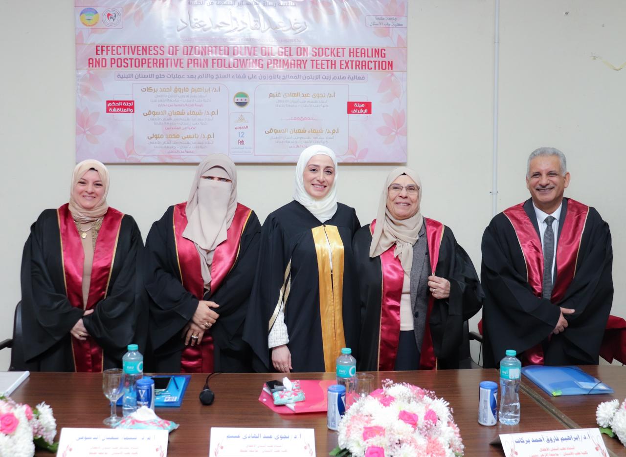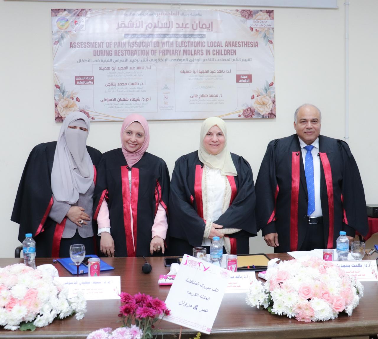 شهدت كلية طب الأسنان جامعة طنطا انعقاد المناقشة العلنية لرسالة الماجستير للطبيبة إيمان عبد السلام الأشقر وذلك يوم السبت الموافق ٢٠٢٦/٢/١٤ وذلك بقاعة المناقشات الدور السادس، وتكونت هيئة الإشراف من السادة الأساتذة :