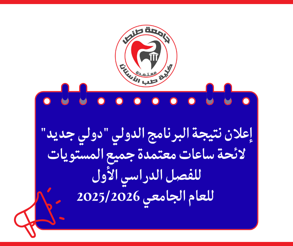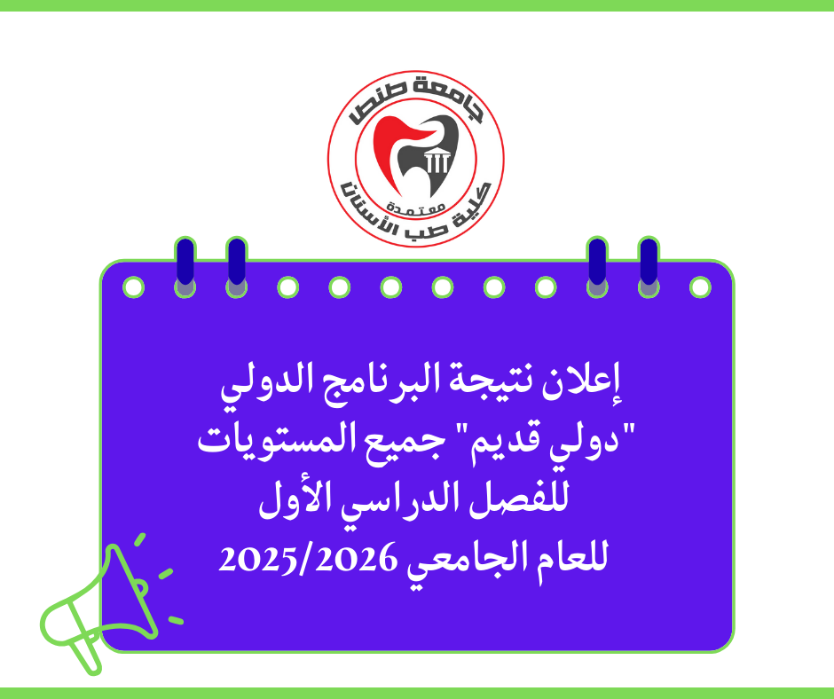 تحت رعاية أ.د فاتن أحمد أبو طالب عميد كلية طب الأسنان جامعة طنطا، و أ.م.د/ نانسي محمد رمضان مدير البرنامج الدولي يعلن قطاع شئون التعليم والطلاب بالكلية طب الأسنان جامعة طنطا عن نتيجة البرنامج الدولي "دولي قديم" جميع المستويات الدراسى الأول للعام الجامعي 2025/2026.