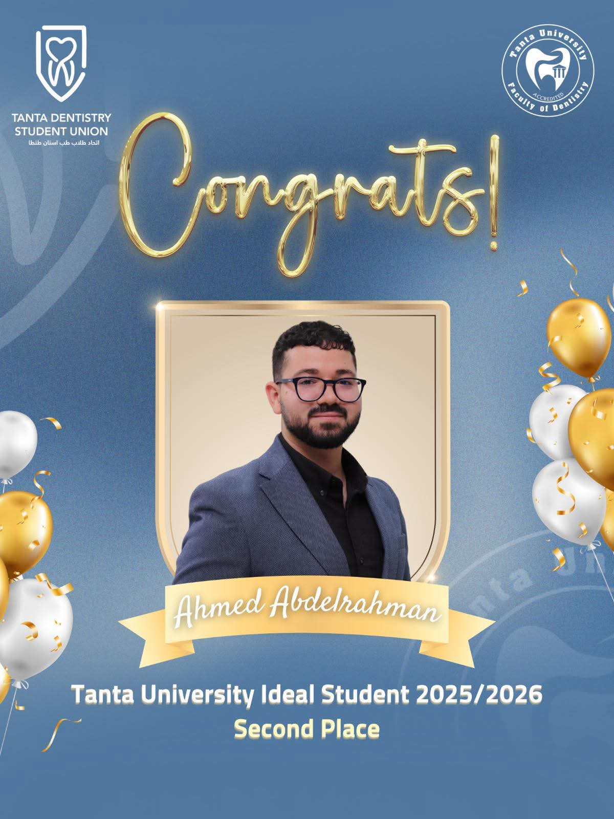 تتقدم ا.د/ فاتن أبو طالب عميد كلية طب الأسنان والسادة الوكلاء وأعضاء هيئة التدريس بخالص التهنئة للطالب احمد عبد الرحمن لحصوله على المركز الثانى فى مسابقة الطالب المثالي على مستوى الكلية و الجامعة لعام ٢٠٢٦ م