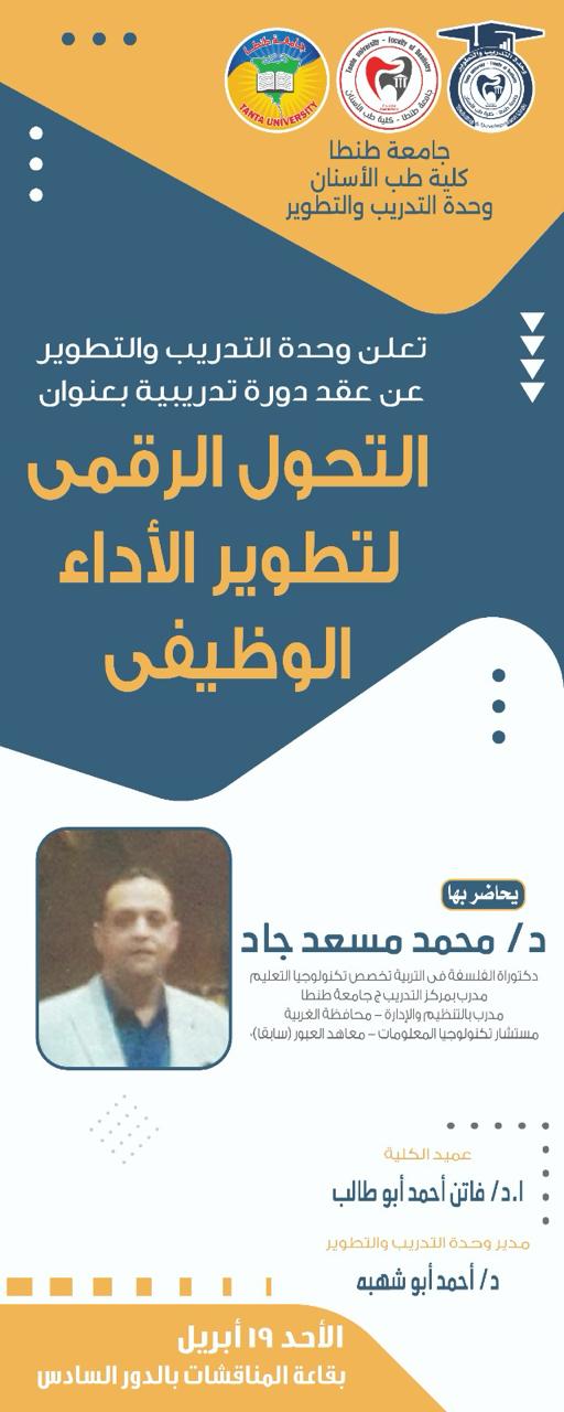 تحت رعاية ا.د/ فاتن أبو طالب عميد كلية طب الأسنان جامعة طنطا، و د/ احمد ابو شهبه مدير وحدة التدريب والتطوير تعلن الوحدة عن عقد دورة تدريبية بعنوان التحول الرقمي لتطوير الأداء الوظيفي ويحاضر بها