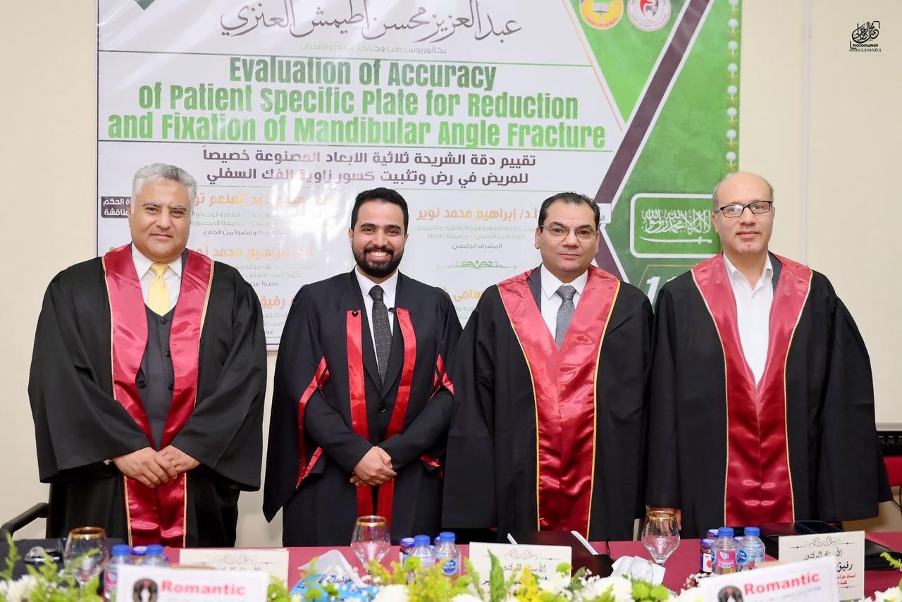 شهدت كلية طب الأسنان جامعة طنطا انعقاد المناقشة العلنية لرسالة الماجستير للطبيب عبدالعزيز محسن اطيمش العنزي وذلك يوم الاربعاء الموافق ٢٠٢٦/٢/١١ م، وتكونت هيئة الإشراف من السادة الأساتذة :