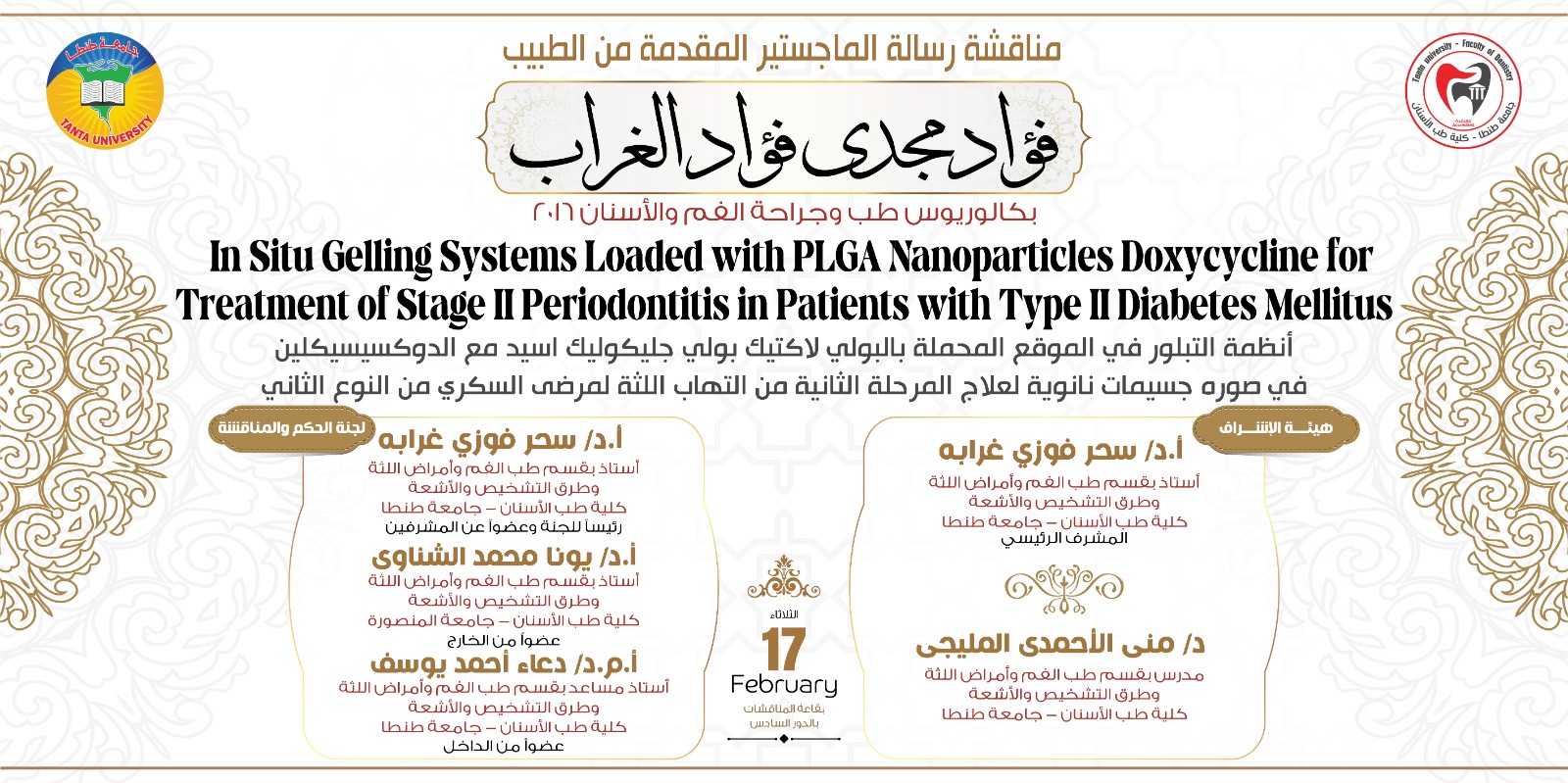 تعلن إدارة الدراسات العليا بكلية طب الأسنان جامعة طنطا عن انعقاد مناقشة رسالة الماجستير للطبيب فؤاد مجدي فؤاد الغراب وذلك يوم الثلاثاء الموافق ٢٠٢٦/٢/١٧ وذلك بقاعة المناقشات الدور السادس، وتتكون هيئة الإشراف من السادة الأساتذة :