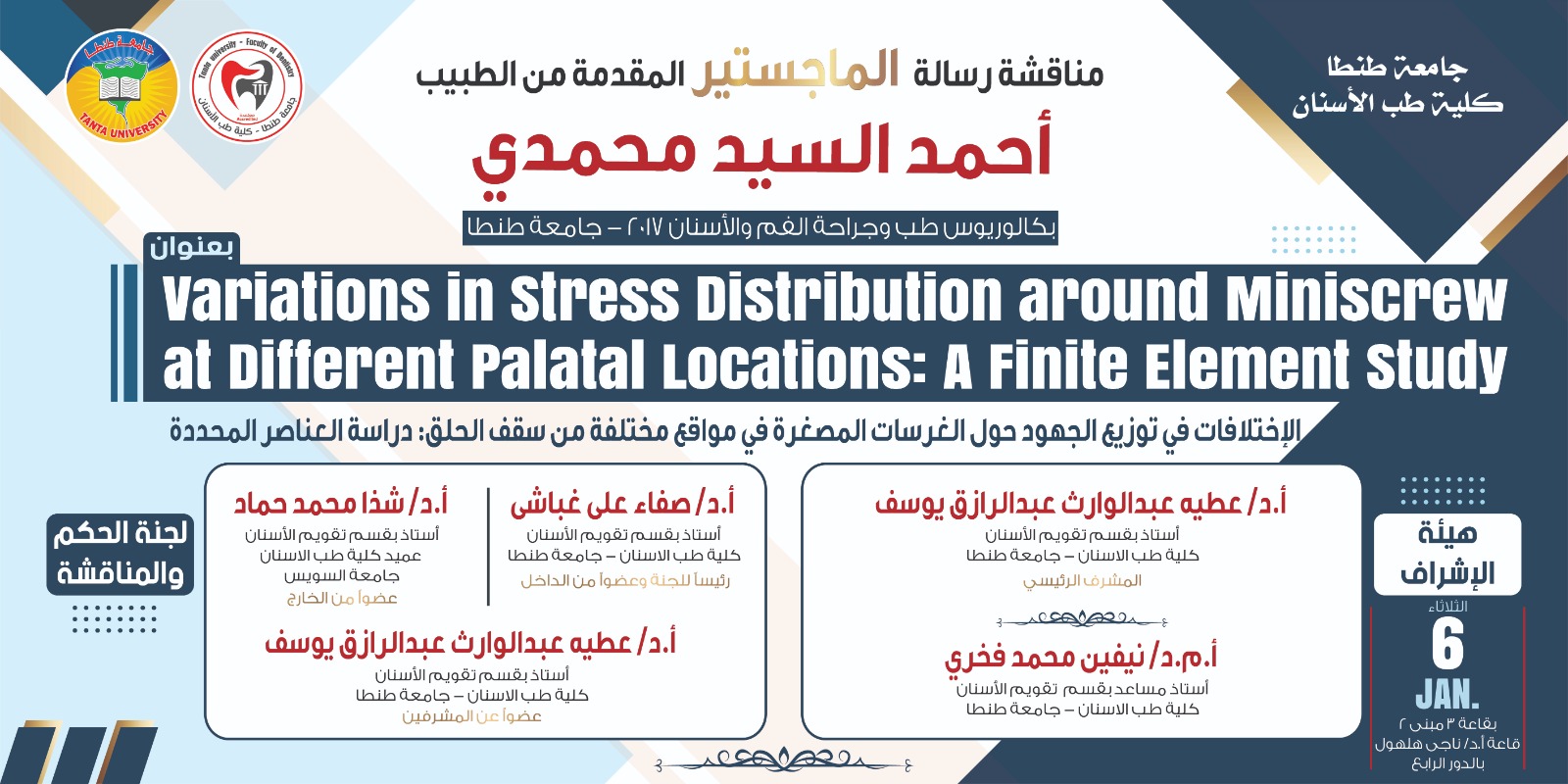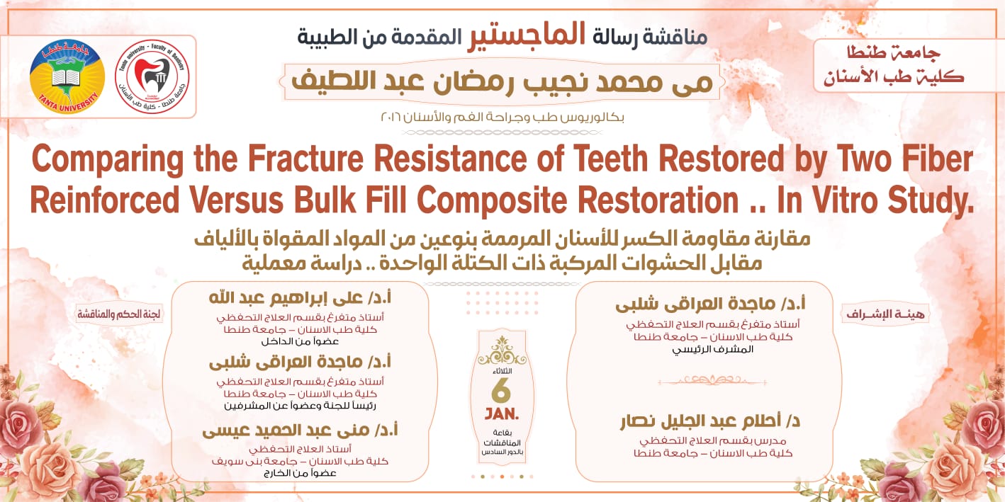 تعلن إدارة الدراسات العليا بكلية طب الأسنان جامعة طنطا عن انعقاد مناقشة رسالة الماجستير للطبيبة مي محمد نجيب رمضان عبد اللطيف وذلك يوم الثلاثاء الموافق ٢٠٢٦/١/٦ م وذلك بقاعة المناقشات الدور السادس، وتتكون هيئة الإشراف من السادة الأساتذة :