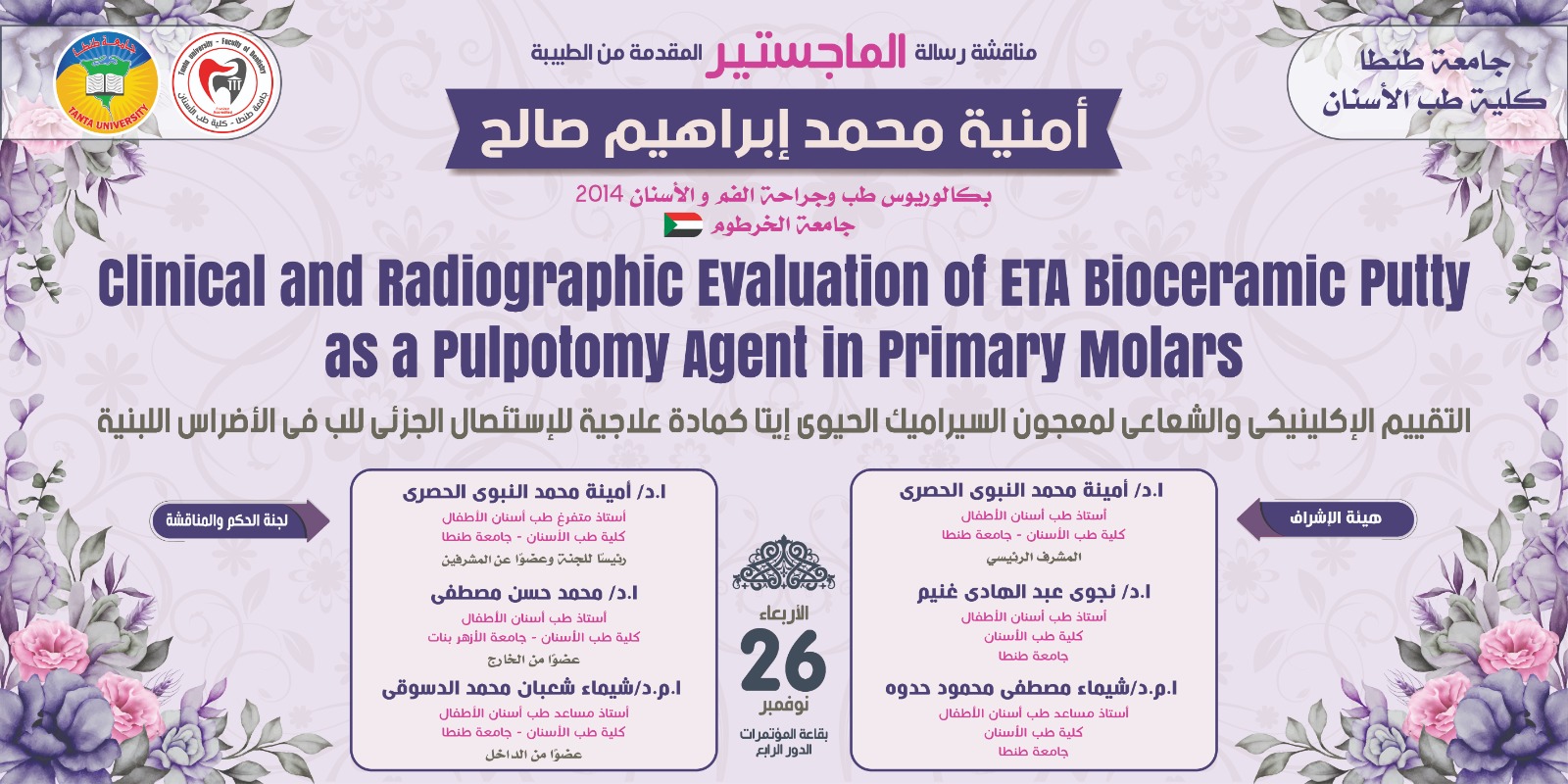 تعلن إدارة الدراسات العليا بكلية طب الأسنان جامعة طنطا عن انعقاد مناقشة رسالة الماجستير للطبيبة امنية محمد ابراهيم صالح وذلك يوم الأربعاء الموافق ٢٠٢٥/١١/٢٦ وذلك بقاعة المؤتمرات بالدور الرابع، وتتكون هيئة الإشراف من السادة الأساتذة :