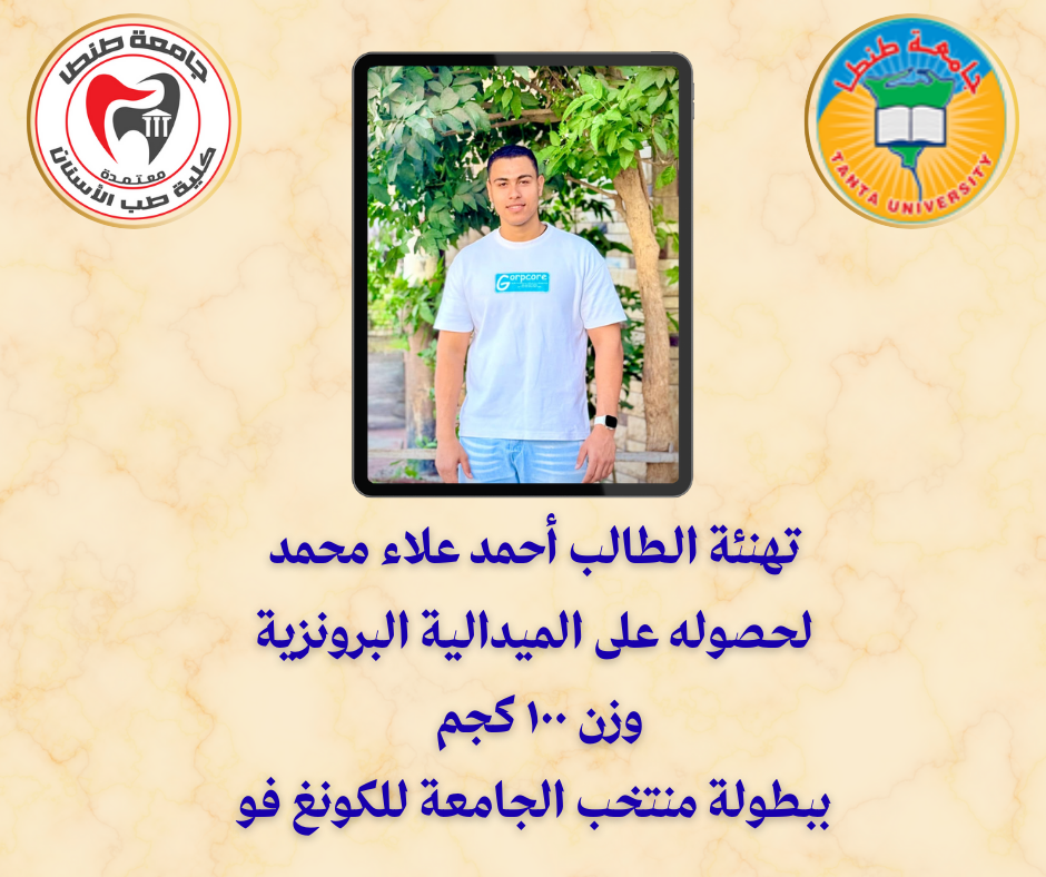 تتقدم ا.د/ فاتن أبو طالب عميد كلية طب الأسنان جامعة طنطا، وا.د/ شيرين عبد المولى علي وكيل الكلية لشئون التعليم والطلاب، والسادة الوكلاء، وأعضاء هيئة التدريس والهيئة المعاونة وإدارة رعاية الشباب والعاملين بالكلية بخالص التهنئة للطالب أحمد علاء محمد المقيد بالكلية لحصولة على الميدالية البرونزية وزن ١٠٠ كجم ببطولة منتخب الجامعة للكونغ فو متمنين لجميع الطلاب دوام التفوق والنجاح.