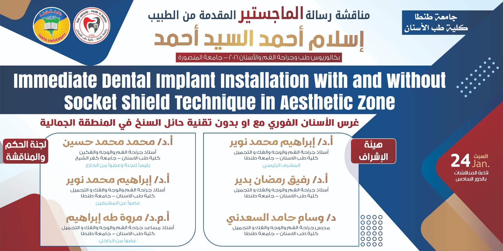 تعلن إدارة الدراسات العليا بكلية طب الأسنان جامعة طنطا عن انعقاد المناقشة العلنية لرسالة الماجستير للطبيب محمد مشحوت انس وذلك يوم الاربعاء الموافق ٢٠٢٦/١/١٤ م، وتكونت هيئة الإشراف من السادة الأساتذه :