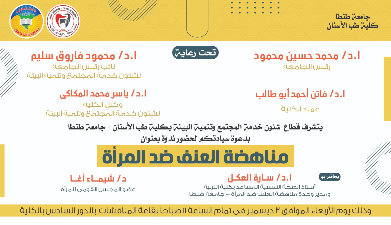تحت رعاية ا.د/ محمد حسين محمود- رئيس جامعة طنطا، و ا.د/ محمود سليم- نائب رئيس الجامعة لشئون خدمة المجتمع وتنمية البيئة، وأ.د/فاتن احمد أبوطالب - عميد كلية طب الأسنان جامعة طنطا، و ا.د/ ياسر محمد المكاكي - وكيل الكلية لشئون خدمة المجتمع وتنمية البيئة، وأ.م.د/ سارة العكل مدير وحدة مناهضة العنف ضد المرأه - جامعة طنطا